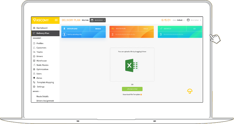 With ASCOMY you can simplify your distribution management, eliminating the need for integration with other organizational systems. In fact, all you have to do is enter the delivery or pickup information for the day into an Excel file and with a click of a button, you can upload it to the cloud.